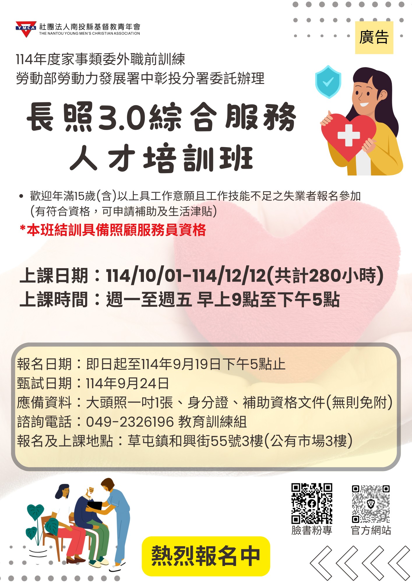 114年度長照繼續教育訓練課程 報名開放中!即日起至報名額滿為止,來充實你的長照服務技能!課程涵蓋:急救應變、精神病長期照顧、CPR+AED、轉移及輔具操作、自立支援訓練等。 課程時間:詳情請看下方課程資訊 上課地點:南投縣草屯鎮和興街55號3樓 招收對象:具備長照服務人員資格,或對長照有興趣的民眾 洽詢專線:049-2326196 教育訓練組快來報名,讓我們一起進階長照專業! 更多課程詳情請見官方網站或掃描海報上的QR [...]